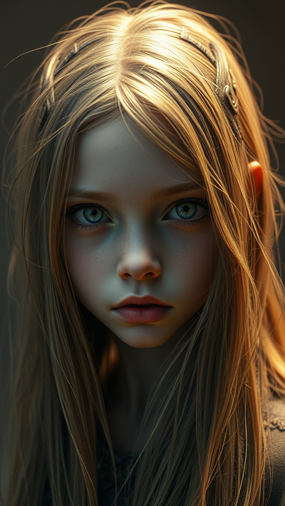 girl, texture, high detail, surreal realism, intricate fine detail, long flowing hair, gray eyes, soft flickering light, 8K resolution, UHD, futuristic elements, organic textures, warm ambient glow, natural materials, cinematic atmosphere, flickering halogen beams, cinematic shadows, intentional distortions, uncommon anatomy, unusual limb configurations, ethereal floating elements, whimsical disconnection, imaginative mutations, abstract beauty, dreamlike clarity, unexpected perspectives.