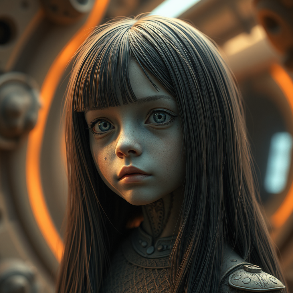 girl, texture, super detail, hyperphotorealism, immense fine detail, long hair, gray eyes, flickering light, 8K, UHD, ultra resolution, futuristic setting, natural textures, warm ambiance, cinematic lighting, halogen glow, artistic imperfections, unusual anatomy, extra or missing limbs, floating or disconnected limbs, mutations, abstract, surreal, ambiguous forms, dreamlike, visually intense, stark contrasts.