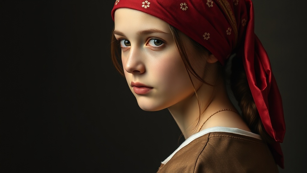 View this AI-generated image featuring girl wearing a crimson bandana harmonious balance soft studio illumination envisioned by a dutch golden age master in the style of johannes vermeer. Created using advanced AI technology, this image showcases creative visuals, AI artwork. Perfect for creative pr