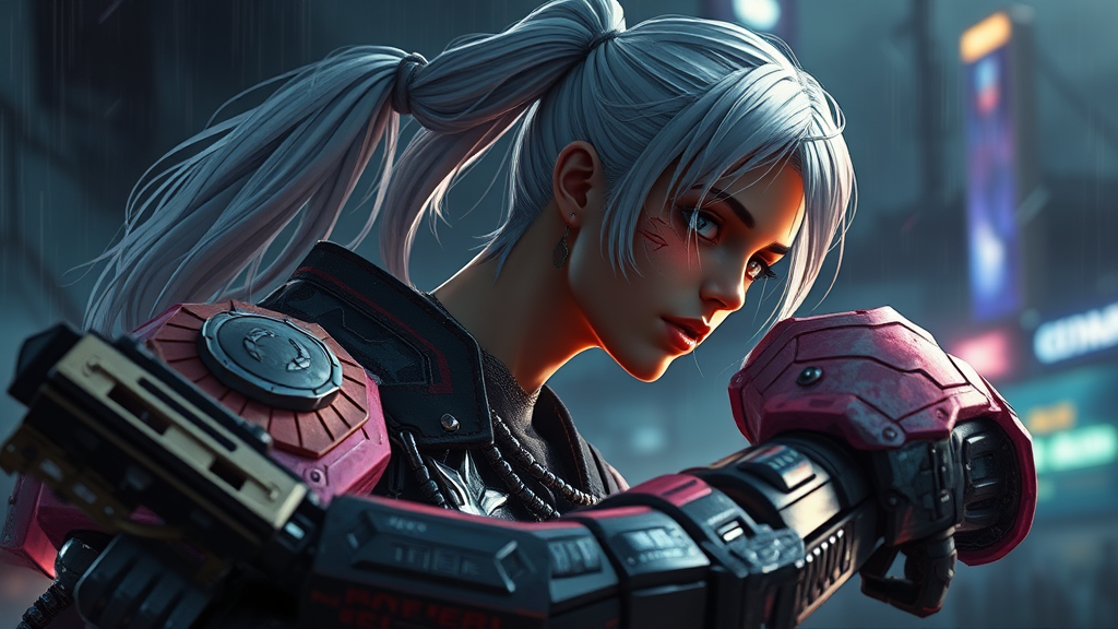 Girl wearing battle-worn mecha armor, white hair tied in a sleek ponytail, set against a dark and stormy night, engaged in an intense combat scene. Despite her injuries, she exudes strength, rendered in a style reminiscent of Borderlands, with intricate details that captivate viewers. The scene is trending on ArtStation for its cinematic mastery and photographic quality, showcasing a stunning environment with a shiny, smooth, and surreal quality that feels celestial and divine. Combining the essence of manga and anime, the atmosphere is vividly colorful with cinematic lighting that adds a hyperrealistic touch. Imagined using Unreal Engine 5 with Lumen reflections for a polished CGI look, every detail is brought to life, while conveying a sense of drama and complexity.