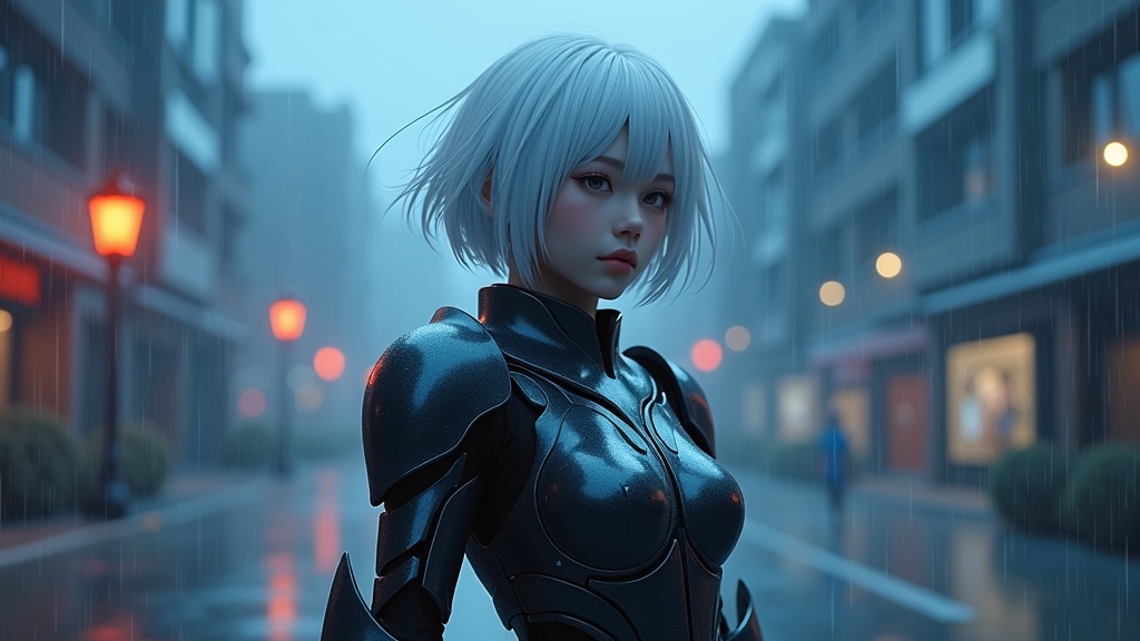 girl wearing gundam-inspired armor, her short snow-white hair gently sways with the gusty night wind, set against a backdrop of a dark, rain-soaked urban landscape, she stands in solitude, capturing attention on artstation, with intricate details, cinematic flair, a true masterpiece, the scene exudes a photographic quality, a breathtaking environment, armor gleaming, seamlessly smooth, surreal and otherworldly, possessing a divine and celestial aura, rendered in a manga anime cgi style, with 3d precision akin to a doll crafted in octane, added creative elements, focusing on atmospheric immersion and unique artistry, avoiding low-quality traits like excessive duplication, awkward anatomy, or unnatural deformities, maintaining impeccable balance and proportion, every element flows harmoniously, achieving a stunning visual symphony that resonates with ethereal beauty and emotional depth.