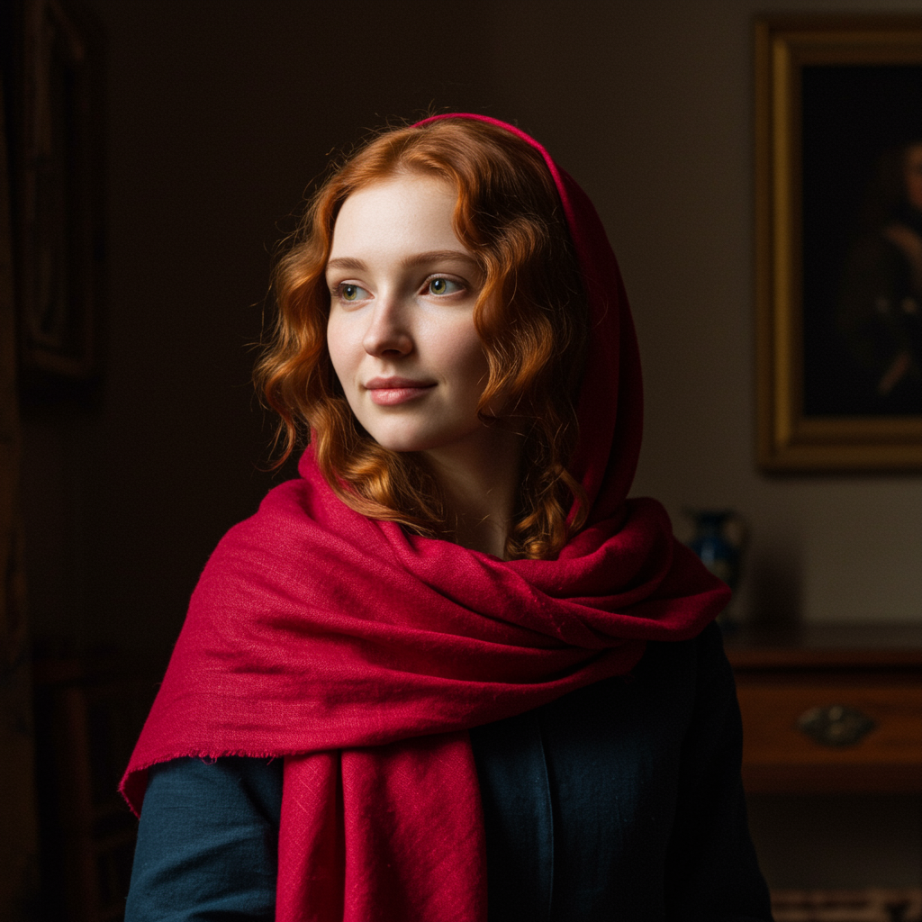 Girl with a crimson scarf, balance and harmony, expert use of light and shadow, reminiscent of works by Dutch Golden Age painter Johannes Vermeer.