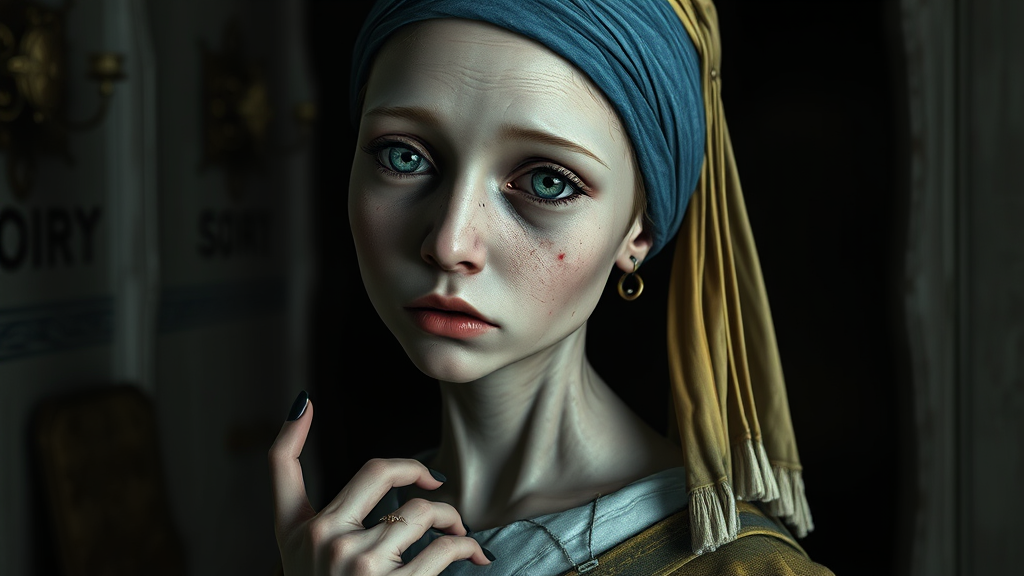Girl with a Pearl Earring inspired horror scene featuring an eerie atmosphere with intricate detail and exceptional anatomy. The scene is rendered in best quality at 500px, cgsociety level, in 8k UHD HDR. The girl possesses a mutated appearance with duplicated facial features, cross-eyed gaze, elongated neck, and extra mutated fingers. Her surroundings evoke a sense of foreboding, with chilling shadows and twisted backgrounds, enhancing the uncanny nature. The image is meticulously crafted to avoid low resolution issues, out of frame elements, blurriness, jpeg artifacts, watermarks, logos, letters, usernames, words, and cropped or cartoonish aspects, ensuring a seamless, hauntingly surreal visual.