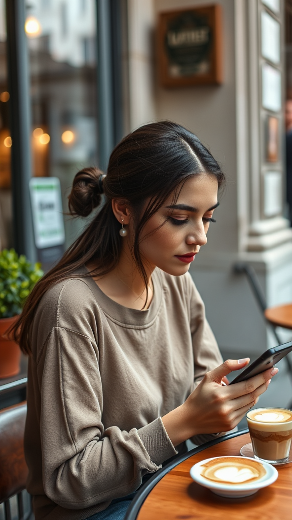 Girl with a pearl earring modern digital photograph in Italy sitting at a street-side bistro glancing at her smartphone cappuccino on the table relaxed-vibe-urban-2068