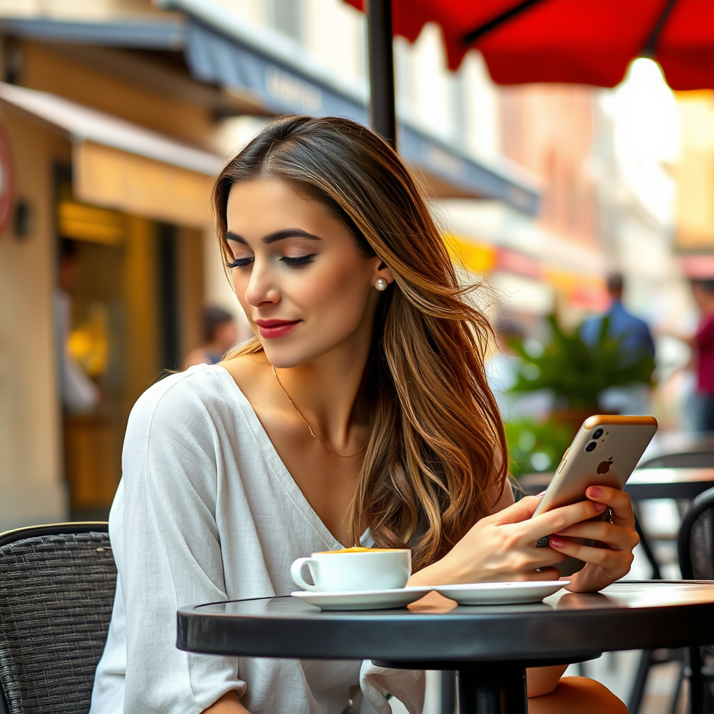 Girl with a pearl earring modern digital photograph in Italy lounging at an outdoor cafe glancing at her smartphone cappuccino on the table vibrant street scene in the background relaxed-atmosphere-visual-2102