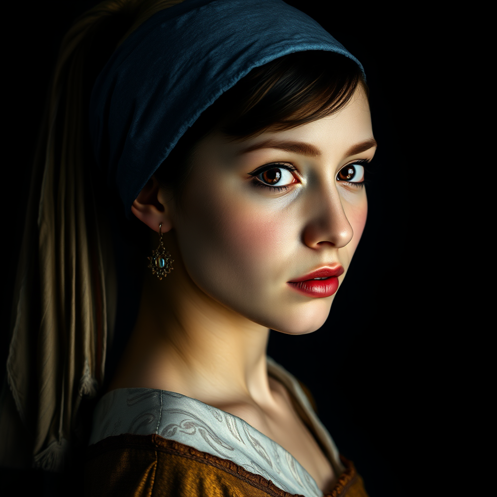 Girl with a Ruby Earring, intense chiaroscuro lighting, meticulously detailed RAW color portrait, ultra-realistic, professional quality, vivid lifelike texture, expressed in unified 8K CG wallpapers, physics-based rendering, authentic realism, high contrast, vivid hyperrealism, captured using an f1.6 lens, deep, enriched colors, extraordinary lifelike detail, cinestill 800 atmosphere, subtle artistic variations maintaining original essence.