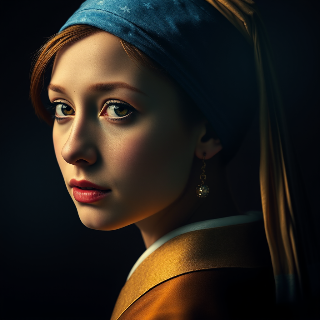 Girl with a Sapphire Earring, dramatic chiaroscuro lighting, vivid and dynamic, ultra-realistic, professional photography, lifelike precision, ultra high resolution 8K wallpapers, cutting-edge physics-based rendering, hyperrealism with high contrast, photographed with an f1.6 lens, deep, rich colors and textures that mimic reality, capturing the essence of Cinestill 800 film, subtle yet captivating creative variations, bringing out a timeless and modern elegance.