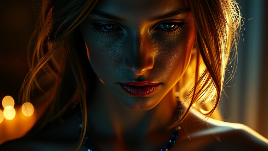 Girl with a Sapphire Necklace, intense chiaroscuro illumination, high fidelity RAW color capture, expert composition, lifelike rendering, ultra high definition 8K resolution, meticulously detailed CGI seamless wallpapers, realistic lighting simulation, high contrast and hyperrealism, cinematic photography, f1.4 lens, vibrant hues, hyper-realistic textures, cinestill 400, subtle creative alterations while preserving the essence.