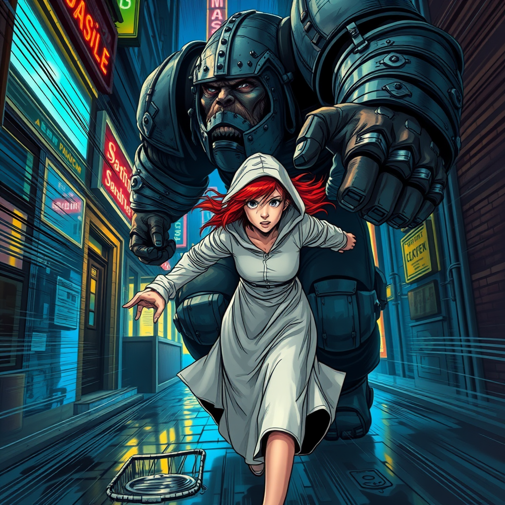 Girl with fiery red locks fleeing in terror, clad in a long-sleeved white dress with a hood cast over her face, her eyes wide with fear as she runs for her life down a narrow, dimly lit alleyway in a gritty, neon-lit metropolis. Behind her, a towering figure in battered, hulking armor, his face a twisted mass of scars and metal plates, his massive hand closing around her wrist as he effortlessly muscles her towards him. The city around them is a blur of blue and yellow lights, the neon signs of rundown bars and seedy venues reflected in the wet pavement, adding to the sense of unease and desperation. The lines around them are thick and bold, the entire scene rendered in a dynamic, stylized comic book aesthetic, while the girl's skin and the armor's metal plating are captured in loving, realistic detail. As our heroine struggles to free herself, the motion lines in the background become increasingly distorted, the blurred lights of the city arcing outward like a maelstrom, while the hands of the attacker are rendered with perfect, photorealistic precision, their grasp around her wrist a viselike grip that's guaranteed to leave her bruised and helpless.