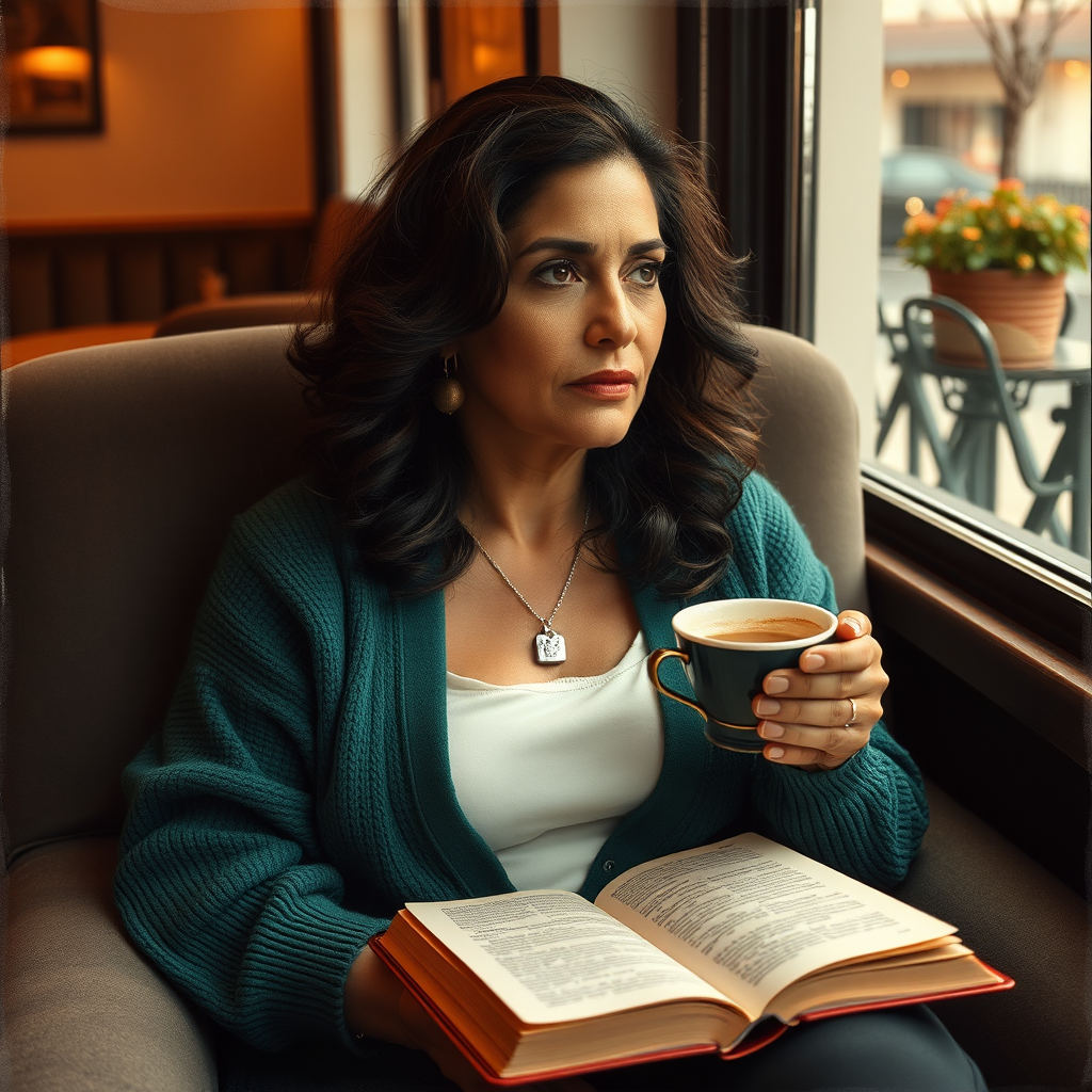 Gökçe Ali, a 44-year-old woman with bronzed olive skin and dark, tumbling curls, settles into a plush armchair at a charming café, enveloped in a soft emerald green cardigan and understated makeup. Around her neck, a delicate silver lock pendant adds a touch of whimsy, its intricate etchings casting a subtle shadow on the dusky fabric of her cardigan. Her eyes, dark and contemplative, soften as she gazes out the window, its warm honey light dancing across the lacework of the patio and casting a golden glow on the pages of the dog-eared novel in her lap. The rich aroma of cardamom-infused coffee wafts from her cup, warming the chilly autumn air, as the soft hum of conversation and the tick of a nearby thermostat fill the air, creating a soothing, late-afternoon ambiance, redolent of a faded Polaroid photograph, its colors muted and iridescent, like a whispered secret.