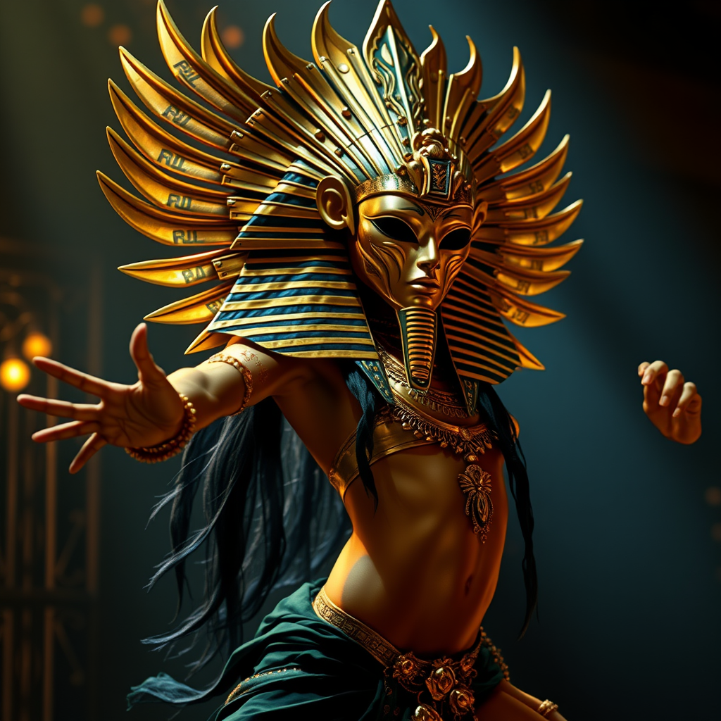 Glam metal Ishtar adorned in an exquisite gold shamrock mask reminiscent of King Tut’s treasures, art by Antonio J. Manzanedo. Striking a dynamic pose, she performs a mesmerizing dance under atmospheric lighting, imbued with a sense of magic and allure.