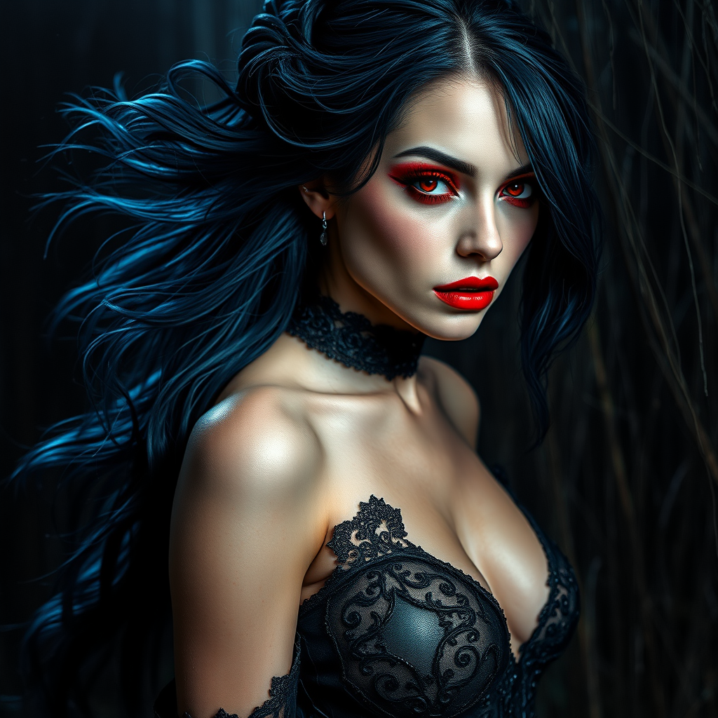 Glamorous and captivating, a bewitching queen vampiress with sensuous alabaster skin, flowing midnight blue hair, and hypnotic crimson eyes. Her presence is enchanting and irresistibly charming. The atmosphere around her is dark, morbid, and rich with gothic allure, drenched in moody ambience. She stands amidst a dense, wet landscape, immersed in epic and dramatic lighting that enhances every bead of sweat on her exquisite frame. Intricately detailed attire clings to her form, exuding an aura of creepiness and ornate beauty. As a true femme fatale, her passionate gaze commands attention, captured in a mesmerizing glamour shot that highlights her fierce realism. The scene is rendered with maximum detail, providing a photorealistic experience, where volumetric lighting adds depth and mystery to the full-body depiction.