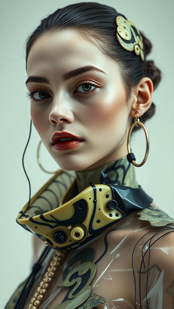 Glamorous avant-garde female model gazes diagonally, adorned in futuristic, eco-friendly fashion featuring bold plastic and latex elements, intricate abstract patterns, and asymmetrical techno embellishments; captured in stunning 4k resolution, medium shot, with a cinematic photography approach inspired by Iris van Herpen's innovative design ethos.