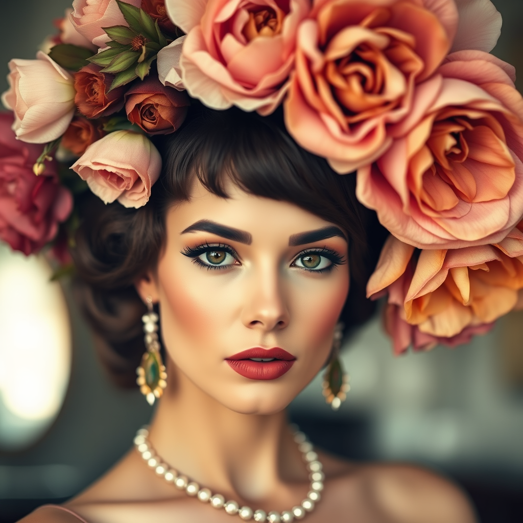 Glamorous fashion model captured with a vintage film look, adorned with an oversized floral headpiece, detailed texture and sharp focus, in 8k resolution, showcasing photo-realistic details and vibrant colors, with a 3:4 aspect ratio. The scene exudes a timeless elegance, highlighting the model's pose and the intricacy of the flower design.