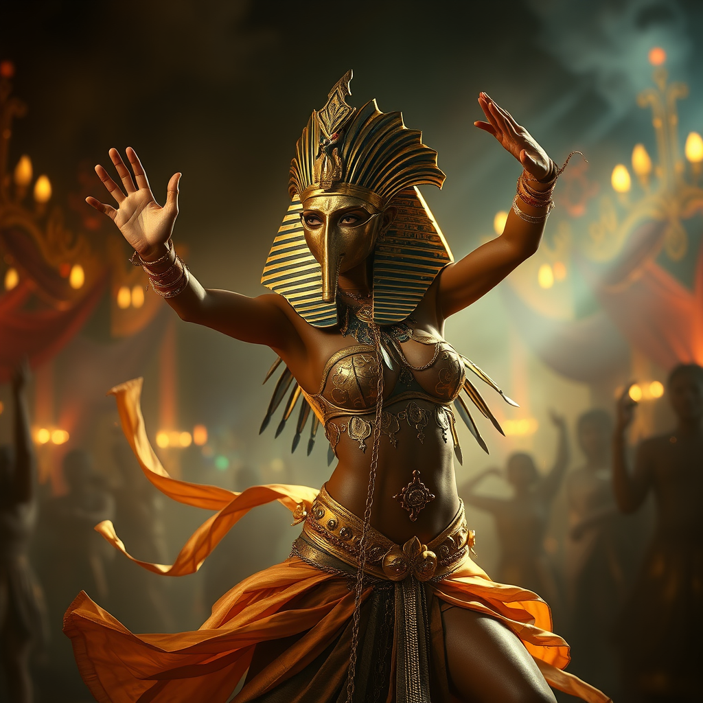 Glamorous metal Ishtar adorned in King Tut's golden clover mask, art by Antonio J. Manzanedo, striking a dynamic pose amidst a breathtaking dance, illuminated by mystical atmospheric lighting, enchanting and mesmerizing scene, intricate details, captivating presence.
