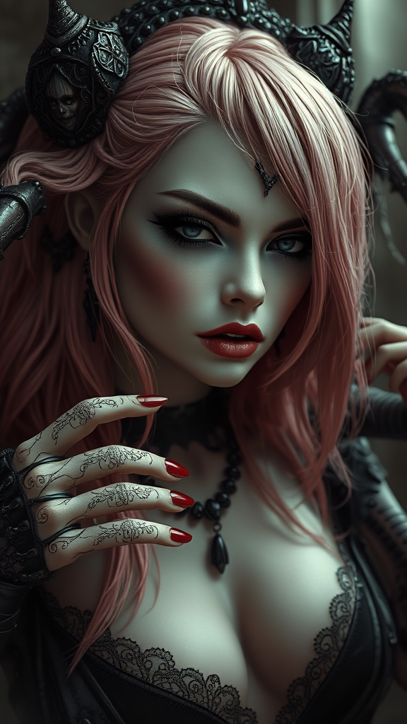 Glamorous portrait of a femme fatale queen of the damned with a morbid and dark allure, featuring highly detailed, wet, and dense atmospheric visuals. The scene is epic and dramatic, with a sense of emptiness and creepiness. Photorealistic and hyperornate details come to life in this intricate, sharp-focus illustration. Captured as if by Irakli Nadar and Reylia Slaby, the image blurs the lines between 3D art, sepia painting, and sketch. The character displays unusual aesthetics, including collapsed eyeshadow, multiple eyebrows, and pink hair. The composition suggests an analog photo quality, featuring otherworldly elements such as multiple limbs and heads, enhancing the surreal and enigmatic atmosphere.