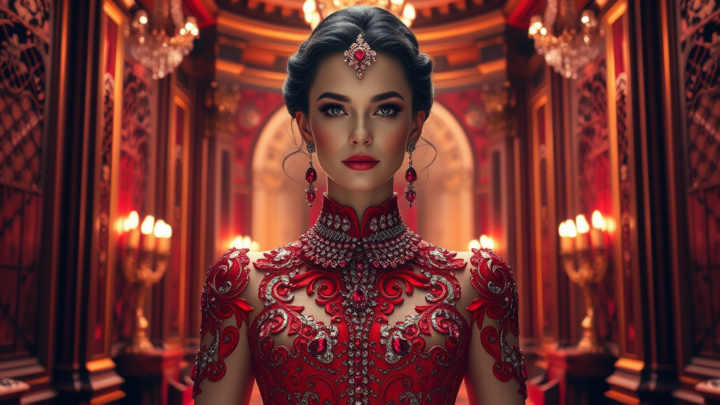 Glamorous woman in a luxurious red gown adorned with radiant rubies and sparkling diamonds, featuring intricate detailing, opulent silk, and exquisite brocade. She stands in a Sci-fi Victorian room, reminiscent of a regal great hall. Her attire, a high-neck bridal gown, exudes elegance, capturing the essence of a sophisticated fashion show. The focus is on her enchanting face, illuminated by cinematic lighting that highlights the ultra-realistic textures in 8k and 4k. Inspired by Peter Mohrbacher, the symmetrical composition avoids hands and fingers, creating a stunning full-body image.