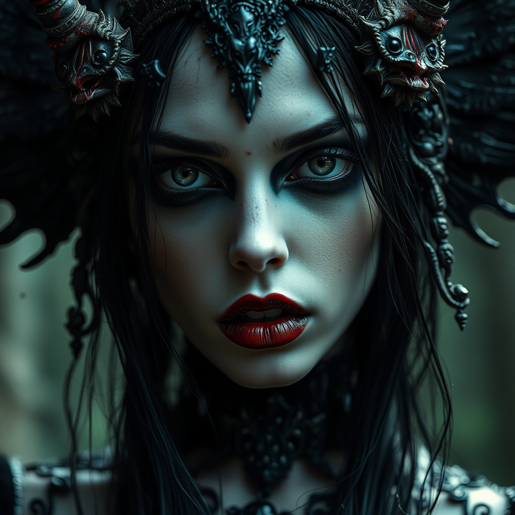 Glamour portrait of a dark, femme fatale queen of the damned, with an otherworldly and morbide allure, intricately detailed and rendered in rich octane. Wet textures and dense, atmospheric elements create an epic and dramatic scene, blending the eeriness of empty, creepy trail cam aesthetics with photorealistic precision. Hyperornate details capture the eye, illuminated by the gentle caress of soft natural lighting, echoing the signature styles of photographers Irakli Nadar and Reylia Slaby. The imagery pulsates with an ethereal yet haunting beauty, embodying the essence of dark mystique.