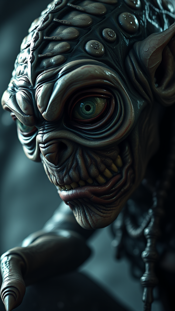 Glamour portrait of Gollum from Lord of the Rings, inspired by J.R.R. Tolkien; morbid, dark, intricately detailed, rendered with Octane, featuring a wet and dense atmospheric ambiance. An epic, dramatic composition with an empty, eerie quality reminiscent of trail cam footage. Photorealistic with hyperornate details, imagined through the lens of photographers like Irakli Nadar and Reylia Slaby. Envisioned in an elongated aspect ratio, maintaining an unsettling yet captivating essence.