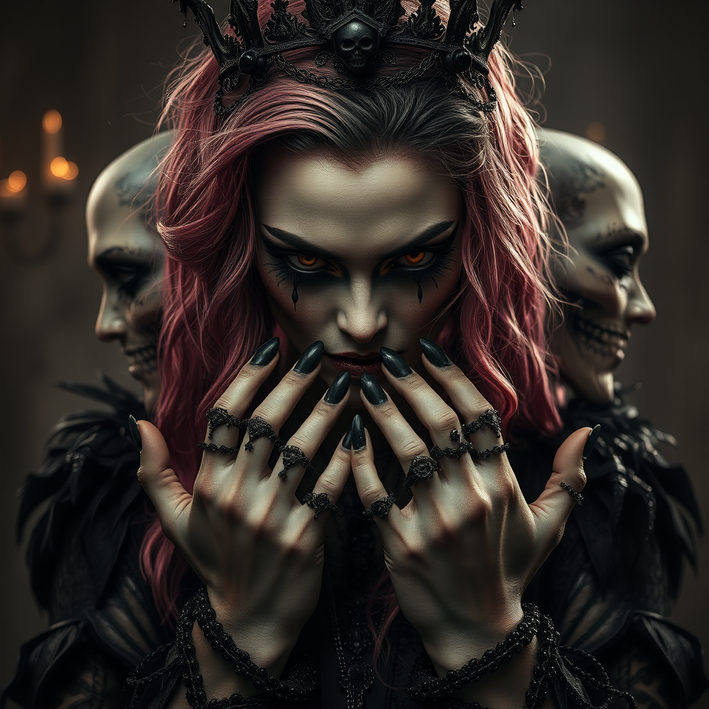 Glamour shot of a dark, femme fatale queen of the damned, exuding a mysterious and morbide allure with a wet, dense atmospheric presence, conveying an epic and dramatic mood. Captured in a photorealistic style with hyperornate details by inspiration from photographers like Irakli Nadar and Reylia Slaby. Emphasizing intricate detailing and sharp focus, this scene introduces elements of sepia tones, combining painting and sketch aesthetics. Featuring a surreal touch with collapsed eyeshadow, pink hair, and a mix of analog photography, there are multiple hands and heads adding to the multifaceted presence, with a subtle incorporation of multiple bodies, lending an unsettling yet captivating ambiance to this otherworldly being.