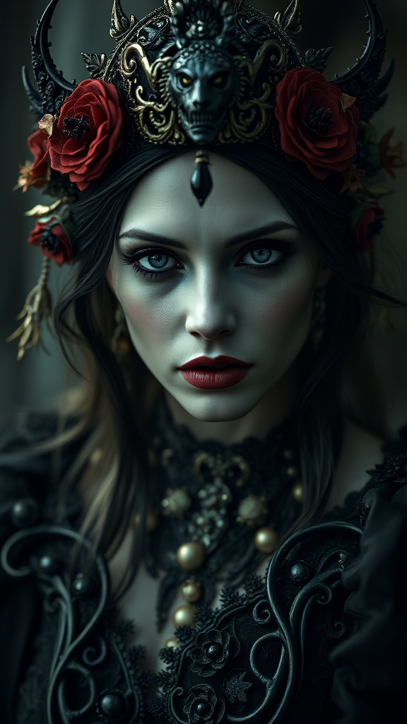 Glamour shot of a dark, morbid femme fatale queen of the damned, deeply atmospheric and photorealistic with hyper-ornate details, rendered in Octane. Capturing a wet, dense atmosphere with an epic and dramatic tone, the scene is reminiscent of eerie, empty trail cam footage. This striking portrait blends the photographic styles of Irakli Nadar and Reylia Slaby, featuring soft, natural lighting that highlights intricate details. The composition evokes a sense of haunting elegance, with a touch of the ethereal and otherworldly.