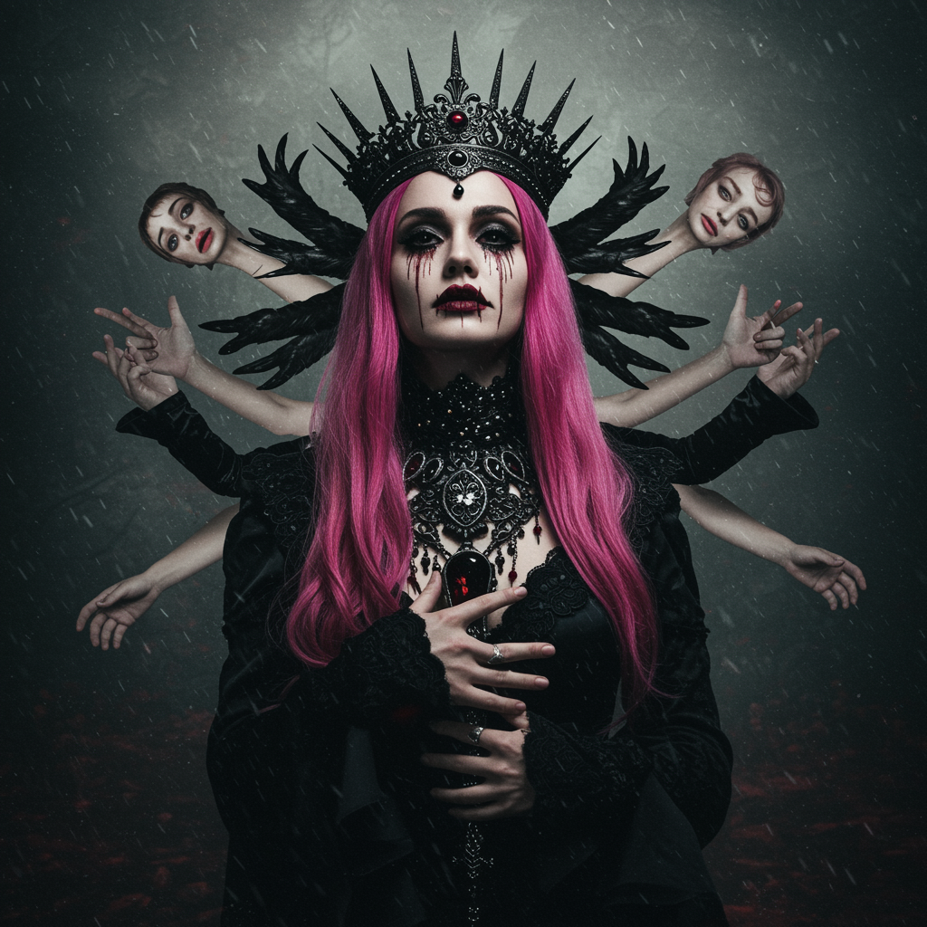 Glamour shot of a Queen of the Damned as a femme fatale, morbid and dark with intricate, hyper-detailed features, showcasing a wet and dense atmospheric background. The scene is epic and dramatic, with an eerie emptiness, blending photorealism with hyperornate details in a sharp focus illustration. Inspired by the artistry of Irakli Nadar and Reylia Slaby, the image combines elements of sepia-toned painting, cartoon, and sketch. The character has collapsed eyeshadow and striking pink hair, surrounded by analog photography aesthetics, featuring surreal elements such as multiple eyebrows, bodies, hands, and heads. The composition is haunting and otherworldly, embodying both beauty and dread.