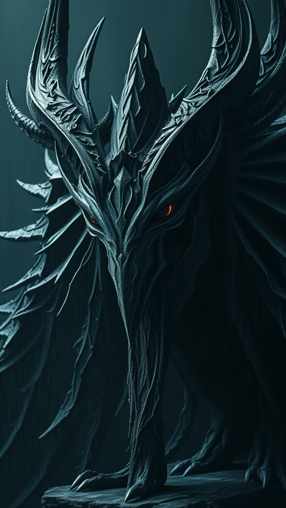 Glamour shot of Sauron, menacing and dark, exquisitely detailed, rendered with a sense of dampness, enveloped in thick atmosphere, epic and dramatic, eerily empty yet captivating, reminiscent of trail cam footage, strikingly photorealistic with intricate details, inspired by John Tolkien, captured by the creative lenses of Irakli Nadar and Reylia Slaby, conveying an aura of both power and desolation.