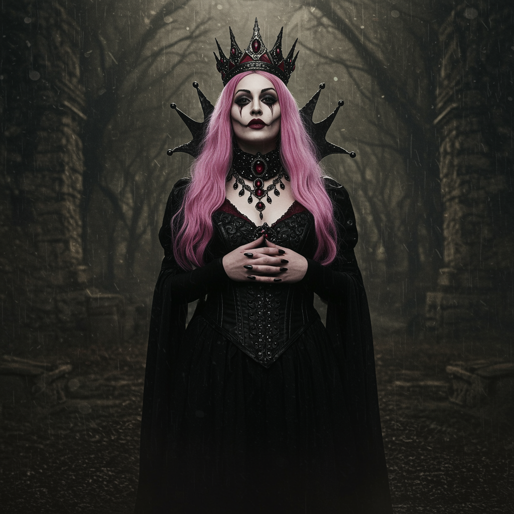 Glamour shot of the Queen of the Damned, a dark and alluring femme fatale, with a morbide and mysterious aura. Captured in a wet, dense atmospheric setting, the scene is epic and dramatic, evoking a sense of eerie emptiness. The image is photorealistic and hyper-detailed, reminiscent of the works of Irakli Nadar and Reylia Slaby, showcasing intricate and ornate details in sharp focus. Blurring the lines between reality and fantasy, the composition combines elements of 3D rendering, sepia tones, and traditional painting techniques. The Queen is depicted with striking, unconventional features: collapsed eyeshadow and pink hair juxtaposed with an otherworldly presence marked by multiple eyebrows and mysterious expressions. Analog photography aesthetics blend seamlessly with subtle cartoon and sketch influences, creating a surreal, dreamlike quality while maintaining an unsettling beauty.