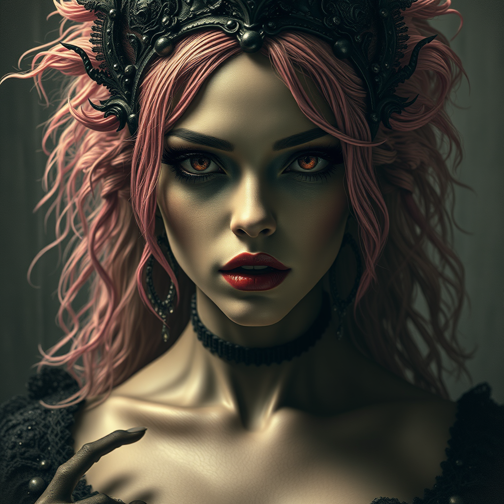 Glamour shot of the Queen of the Damned, a femme fatale with a morbid and dark allure, incredibly detailed with wet, dense atmosphere. The scene is epic and dramatic, featuring an empty yet creepy ambiance captured in a photorealistic style, with hyperornate details reminiscent of works by photographers Irakli Nadar and Reylia Slaby. The illustration is intricately detailed and sharply focused, incorporating elements of 3D, sepia tones, and artistic touches of painting, cartoons, and sketches. She has an ethereal presence with pink hair that adds a surreal touch. Her eyes hold the mystery of collapsed eyeshadow and multiple eyebrows, while the overall composition plays with analog aesthetics. The scene suggests a haunting multiplicity, with echoes of multiple bodies, hands, and heads, creating a spectral vision that is both captivating and unsettling.