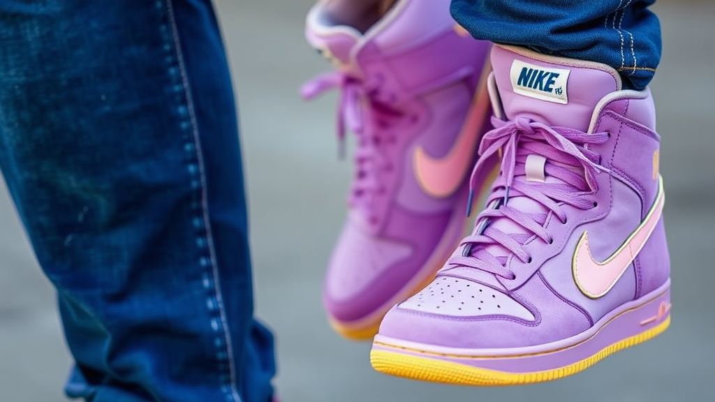 Glancing down, my eyes catch a glimpse of vibrant kicks—a pair of high-top Nikes, resplendent in lavender suede accented with lemon-hued tips. They contrast strikingly against the indigo gradient of my faded denim jeans.
