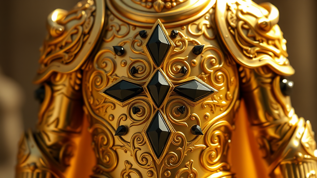 Gleaming in radiant gold, the armor of divine strength stands as a shield against the forces of darkness, embodying the eternal battle between good and evil; intricate patterns shimmer across its surface, studded with enigmatic black diamonds that absorb malevolence, casting an aura of unwavering resolve and celestial fortitude.