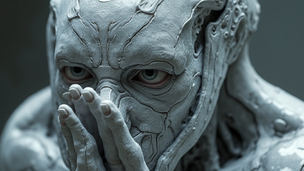 Gleaming, refined metal humanoid visage, contorted into surreal forms, exhibiting a frosty, mirror-like texture that merges organic and mechanical characteristics, rendered in a monochrome palette, lifelike, ultra-high-definition with intricate details, aspect ratio 9:16.