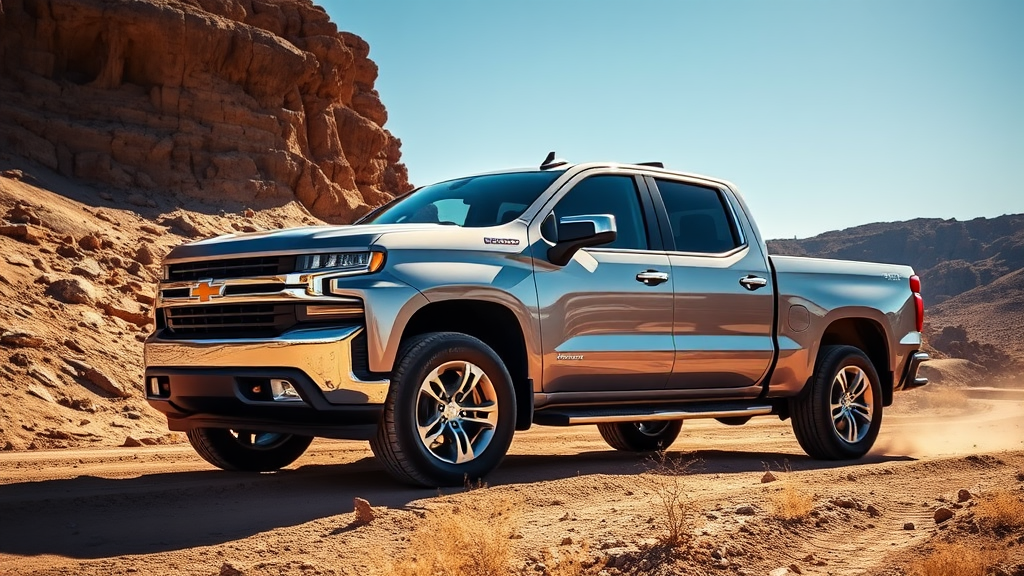 Gleaming under the sun, the rugged Silverado confidently tackles rough terrains, balancing power and precision in its sleek, metallic frame.