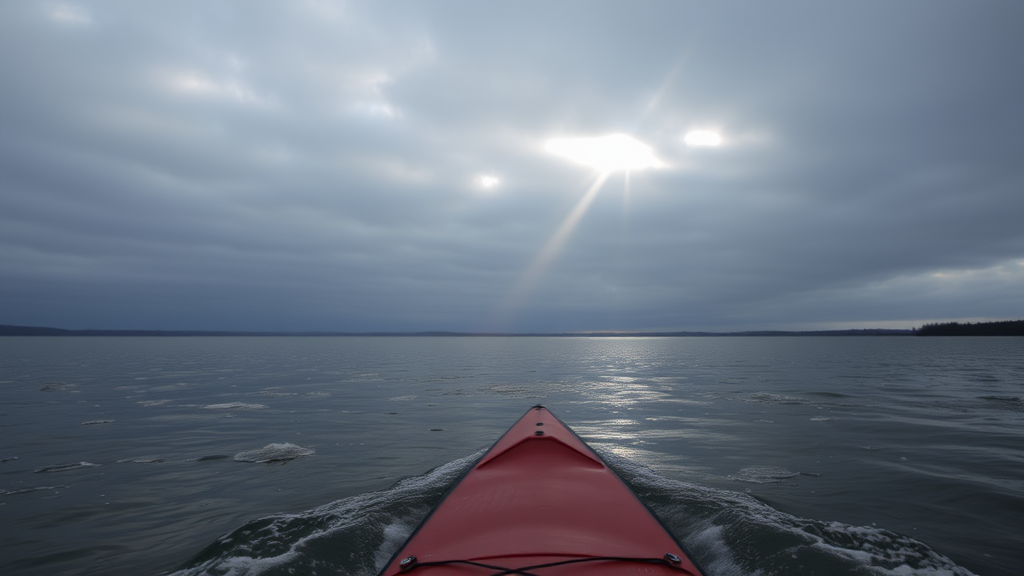 Glide across a chilly lake, beneath a blanket of overcast skies, where a single beam of sunlight pierces through, casting a warm glow on the water's surface.