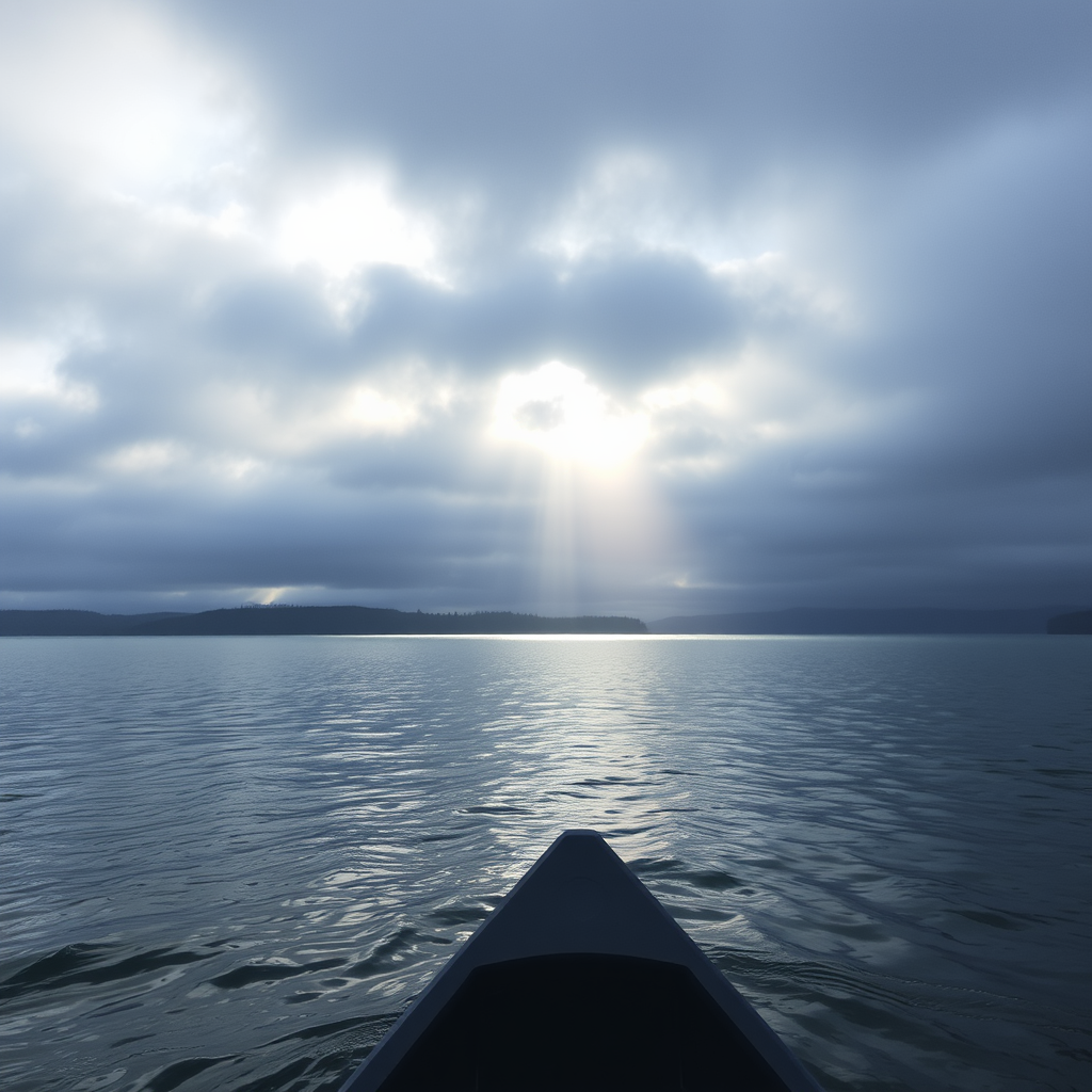 Glide across a chilly lake under a blanket of clouds, where a single sunbeam pierces through, casting a warm glow on the shimmering water.