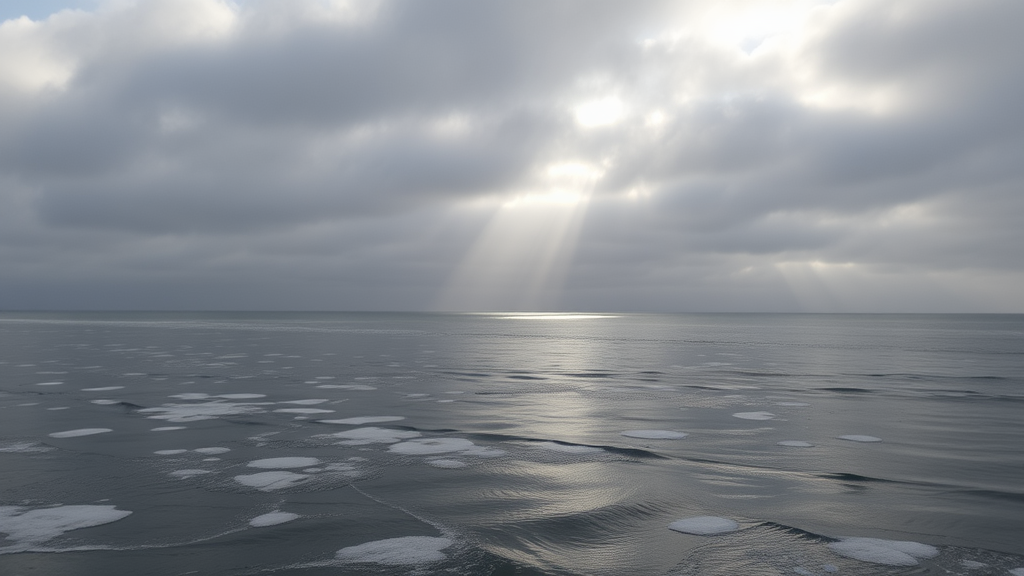 Glide across a chilly lake, under a blanket of gray clouds, where a single beam of sunlight pierces through, illuminating the water's surface with a soft, golden glow.