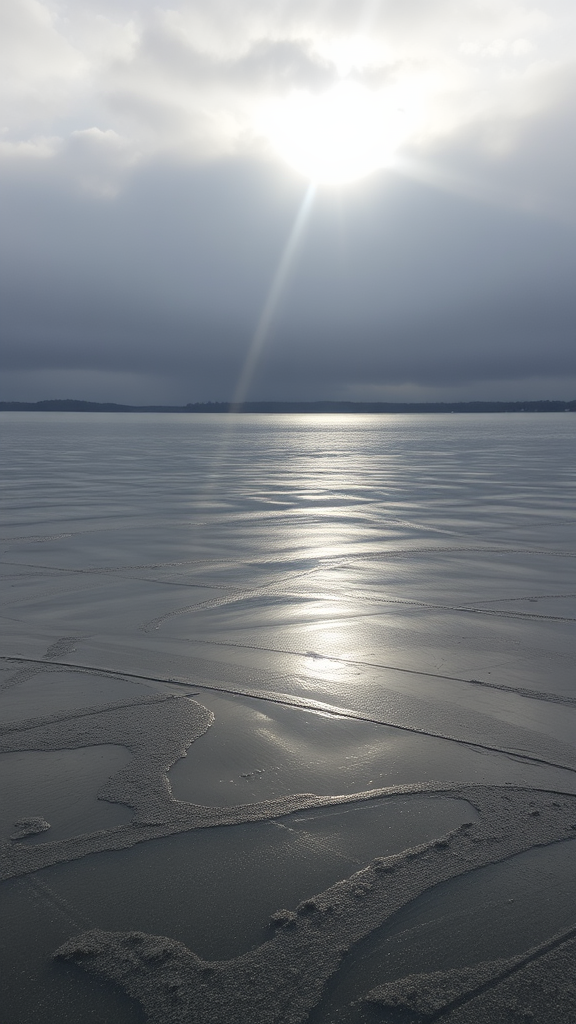Glide across a chilly lake, where the overcast sky parts to reveal a single sunbeam piercing through the gray, casting a golden path on the water.