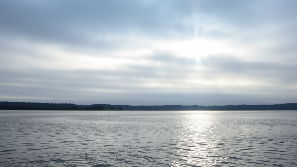 Glide across a chilly lake, where the overcast sky parts briefly to let a single beam of sunlight dance on the rippling water.