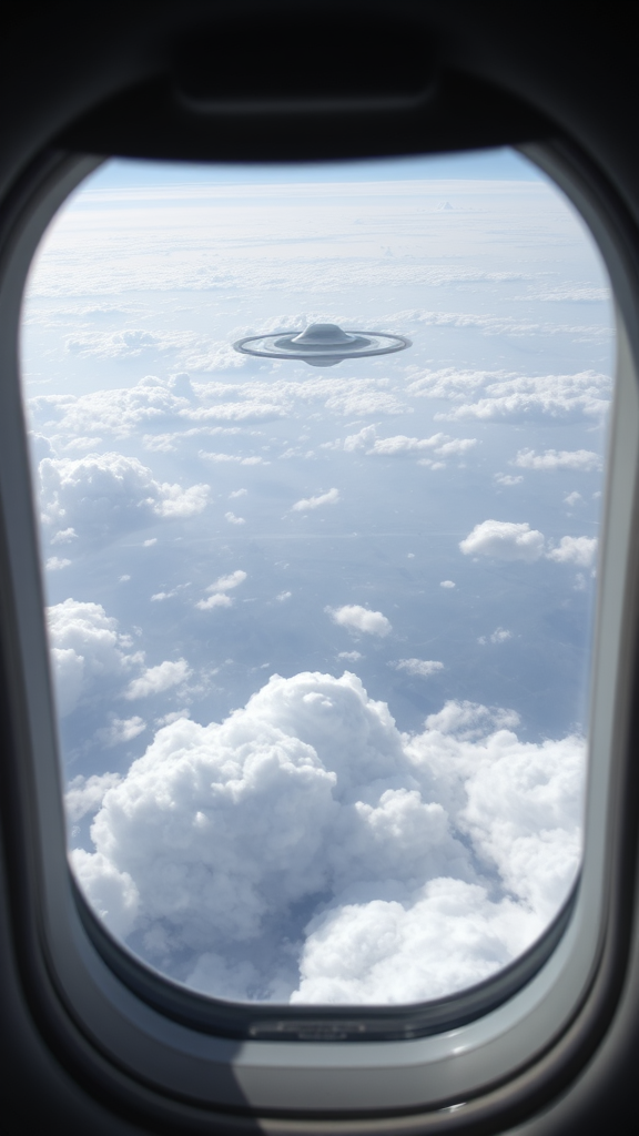Glimpse from within a passenger aircraft, fluffy white clouds drift by the window while a mysterious UFO hovers just beyond, creating an intriguing silhouette against the vast sky.