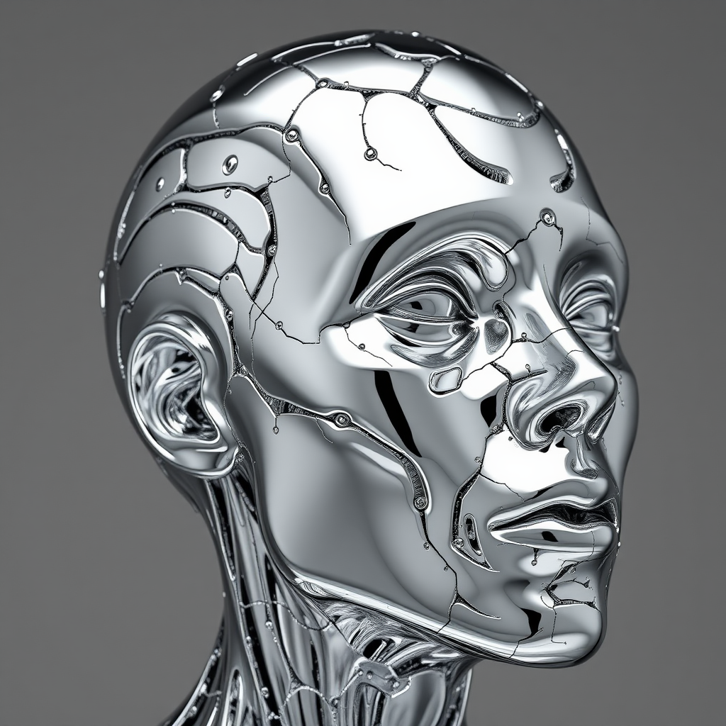 Glistening metallic humanoid visage, intricately warped into surreal patterns, showcasing a seamless fusion of organic contours and mechanical precision. The cold, mirrored surface exudes a silver sheen, capturing intricate reflections that suggest a harmony between life and technology. This monochromatic creation boasts ultra-high definition clarity, revealing every textured nuance of its polished chrome-like exterior, offering a mesmerizing blend of realism and abstract allure in a towering 9:16 aspect ratio.