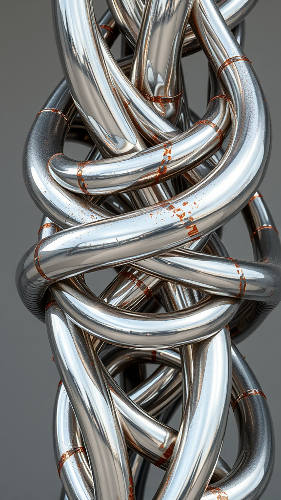 Glistening silver and bronze melded together, forming an intricate abstract structure. The metallic surface is polished to a mirror finish, reflecting light in a dazzling display. Shadows play across its curves, creating a sense of depth and complexity. The composition suggests a sense of industrial elegance, with hints of rust adding character and an organic feel. Vertical orientation enhances its looming presence, evoking both strength and fragility in its towering form.