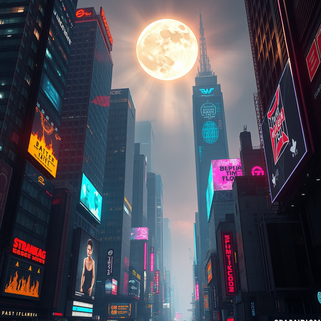 Glistening under the moonlight, the towering skyscrapers of the cyber dystopian city are adorned with vibrant neon lights and flickering holographic billboards, casting a surreal glow. The scene is captured in high-definition, exuding a cinematic atmosphere with grainy textures and dramatic contrast. The metropolis pulsates with energy, each building a testament to the advanced yet chaotic world, with 8k clarity revealing every intricate detail of this enigmatic urban landscape.
