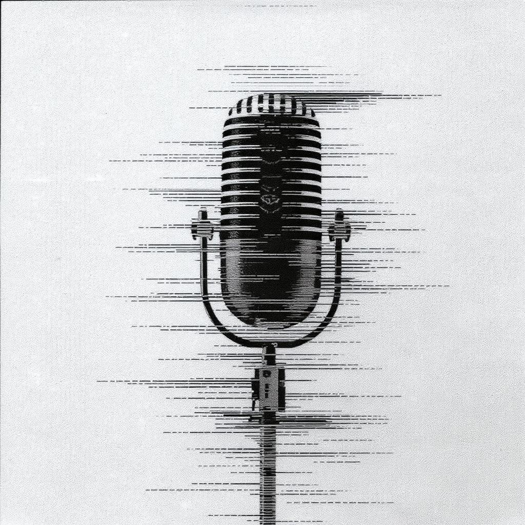Glitch art featuring linear distortion and horizontal scan lines, vertical portrait of a lone microphone silhouette on a minimal white backdrop, the figure exhibits horizontal distortion with a scan line interference pattern, bathed in soft diffused light, showcasing a corrupted data aesthetic with a textured noise and horizontal artifacts, preserving an essence of digital disruption.