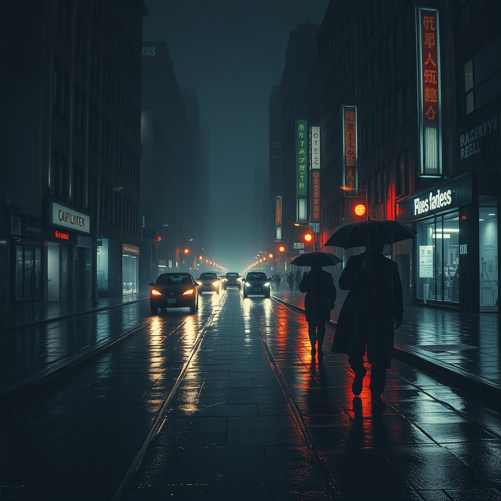 Gloomy urban landscape shrouded in misty rain, dimly lit streets reflecting neon glows, shadows dancing along wet pavement, distant hum of traffic merging with raindrops, cloaked figures hurrying beneath umbrellas, atmospheric whispers of mystery and intrigue in every corner.