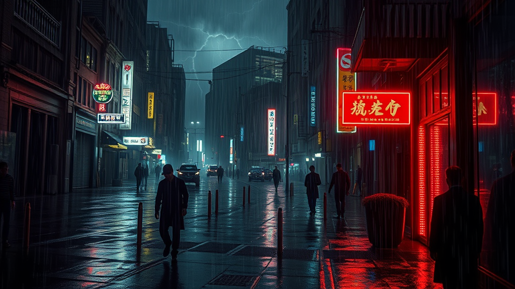 Gloomy urban landscape under a heavy downpour, illuminated by flickering neon lights reflecting off slick streets, mysterious silhouettes moving through shadowy alleyways, the sound of distant thunder echoing through the cityscape.