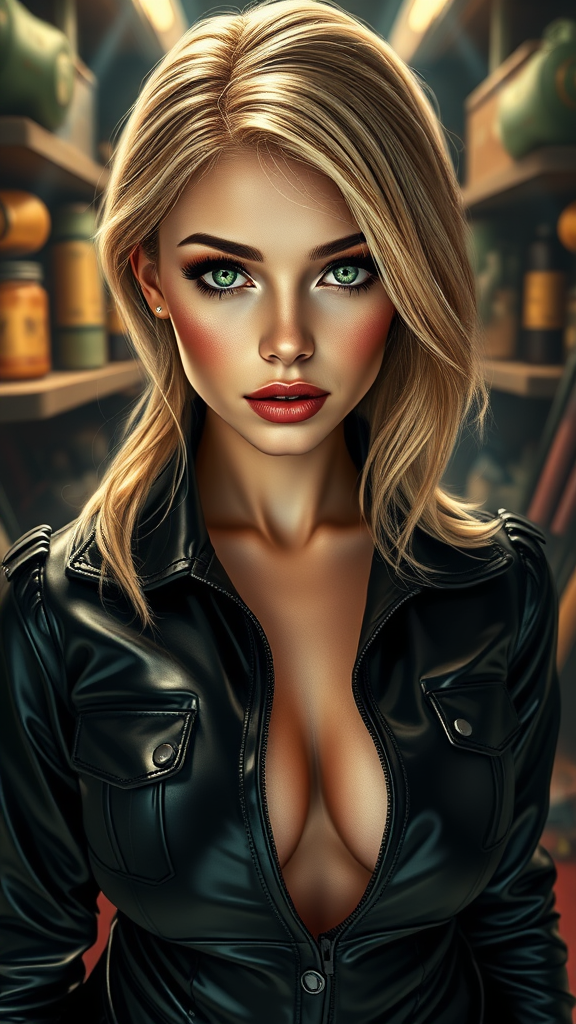 Glossy, alluring, bimbo-inspired, single woman focus, highly detailed, symmetrical features, irresistibly cute, with a revealing neckline, petite figure, luscious lips, captivating green eyes, lifelike pupils, full-body portrayal, radiant blonde hair, superhero motif, leather ensemble, central composition, downward gaze, standing posture, realistic skin texture with visible pores and subsurface scattering, detailed background resembling a bunker with various items, lifelike proportions, charming blush, retro 1800s vintage aesthetic, light beams and caustic effects, exceptional masterpiece quality, hyperrealistic, sharp focus, ultra-high resolution, exemplary anatomy.