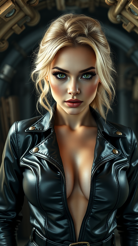 Glossy bimbo-inspired woman, solo pose, detailed symmetrical face, cute features, plunging neckline, petite bust, pouty lips, striking green eyes with realistic pupils, full body depiction, blonde superhero with leather attire, standing posture, direct gaze, clear skin pores and realistic texture with subsurface scattering, shiny complexion, exposed midriff, set in a bunker with detailed background elements, balanced proportions, subtle blush, vintage retro vibes, reminiscent of the 1800s, bathed in light rays and caustics, masterpiece quality, hyperrealism, sharp focus, superb anatomy, items around adding context, blending absurd resolution with high detail.
