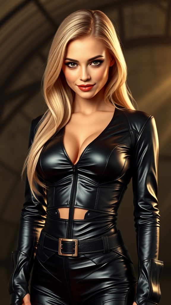Glossy, captivating bimbo, a stunning woman, stands solo with a detailed, symmetric, and cute face. Her plunging neckline reveals a delicate portrayal of small breasts, with lips accentuating her charming smile and mesmerizing green eyes with realistic pupils. This full-body portrayal showcases her in a leather superhero outfit with sleek blonde hair cascading around her shoulders. She stands confidently, centered in the frame, looking down slightly, emphasizing her composed demeanor. The image highlights realistic skin texture with visible pores, subsurface scattering, and a shiny finish, showcasing midriff definition. The backdrop is a meticulously detailed bunker, offering a vintage and retro vibe reminiscent of the 1800s, woven with light rays and caustics that create a masterpiece of visual intrigue. This portrayal offers best-quality, hyperrealistic imagery with sharp focus and absurd resolution, ensuring good anatomy and realistic proportions. Her skin glows with a subtle blush, enhancing the overall realism and intricate detailing of this high-quality representation.