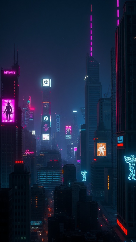 In the dim glow of night, the cityscape is dominated by towering structures adorned with radiant neon lights, casting vibrant hues across the skyline. Holographic advertisements flicker with a pulsating energy, painting stories in the air of a cyber dystopian world. The scene is captured with a keen eye for detail, invoking a sense of cinematic grit with a gentle noise permeating the image. Shadows and lights play in high contrast, revealing the intricacies of a world both futuristic and haunting. The expansive view, rendered in stunning 8k resolution, captures the essence of a sprawling metropolis, where technology and decay coexist uneasily.
