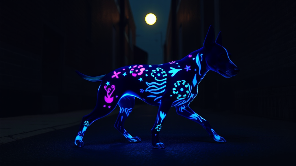Glow-in-the-dark canine with iridescent fur illuminates the night, casting vibrant patterns of neon blues and purples on its sleek coat, as it moves with an ethereal grace through shadowy alleyways under the moonlit sky.
